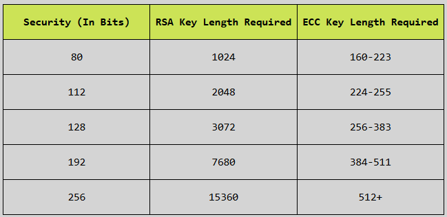 Ưu điểm của hệ mật mã trên đường cong elliptic (ECC - Elliptic Curve Cryptography) là nó sử dụng khóa có độ dài nhỏ hơn RSA truyền thống. Hãy xem lại bảng thống kê dưới đây để thấy rõ điều đó:
