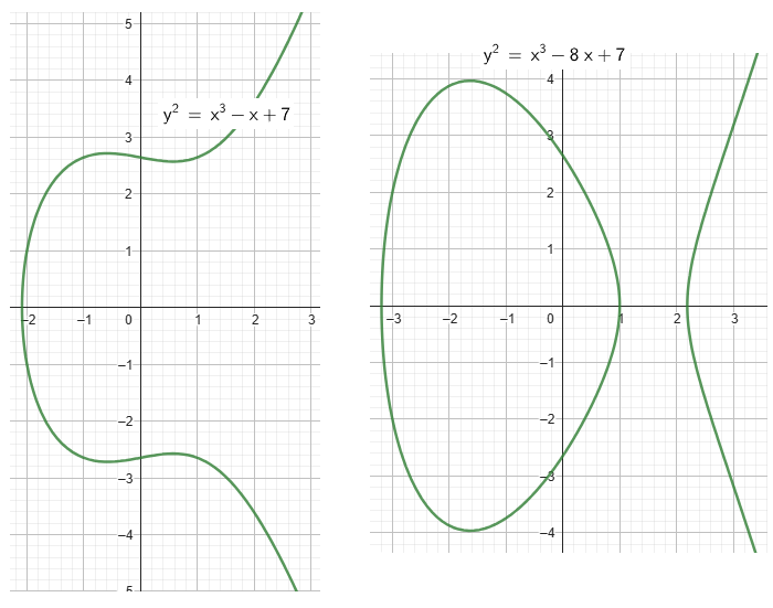 Điều kiện này đảm bảo rằng đường cong không có điểm kỳ dị (singular point), chẳng hạn như điểm nhọn hoặc giao cắt với chính nó. Nếu điều kiện này được thỏa mãn, đường cong được gọi là non-singular elliptic curve. Về mặt đồ thị, đường cong có 2 dạng như bên dưới: