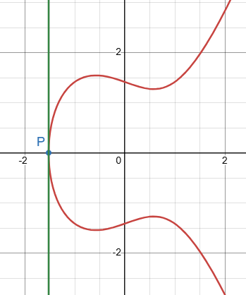 Rõ ràng tiếp tuyến tại sẽ song song với trục tung và không cắt đường cong. Theo quy ước của elliptic curve thì giao điểm được xem như ở vô cực . Do đó: