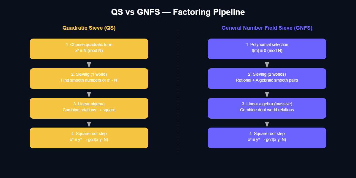 GNFS: Phía hữu tỉ thì dễ, nhưng phía đại số bạn phải khai căn một tích các phần tử . Vì tích này cực kỳ lớn, ta phải dùng các thuật toán chuyên sâu để tìm căn bậc hai mà không cần nhân trực tiếp.
